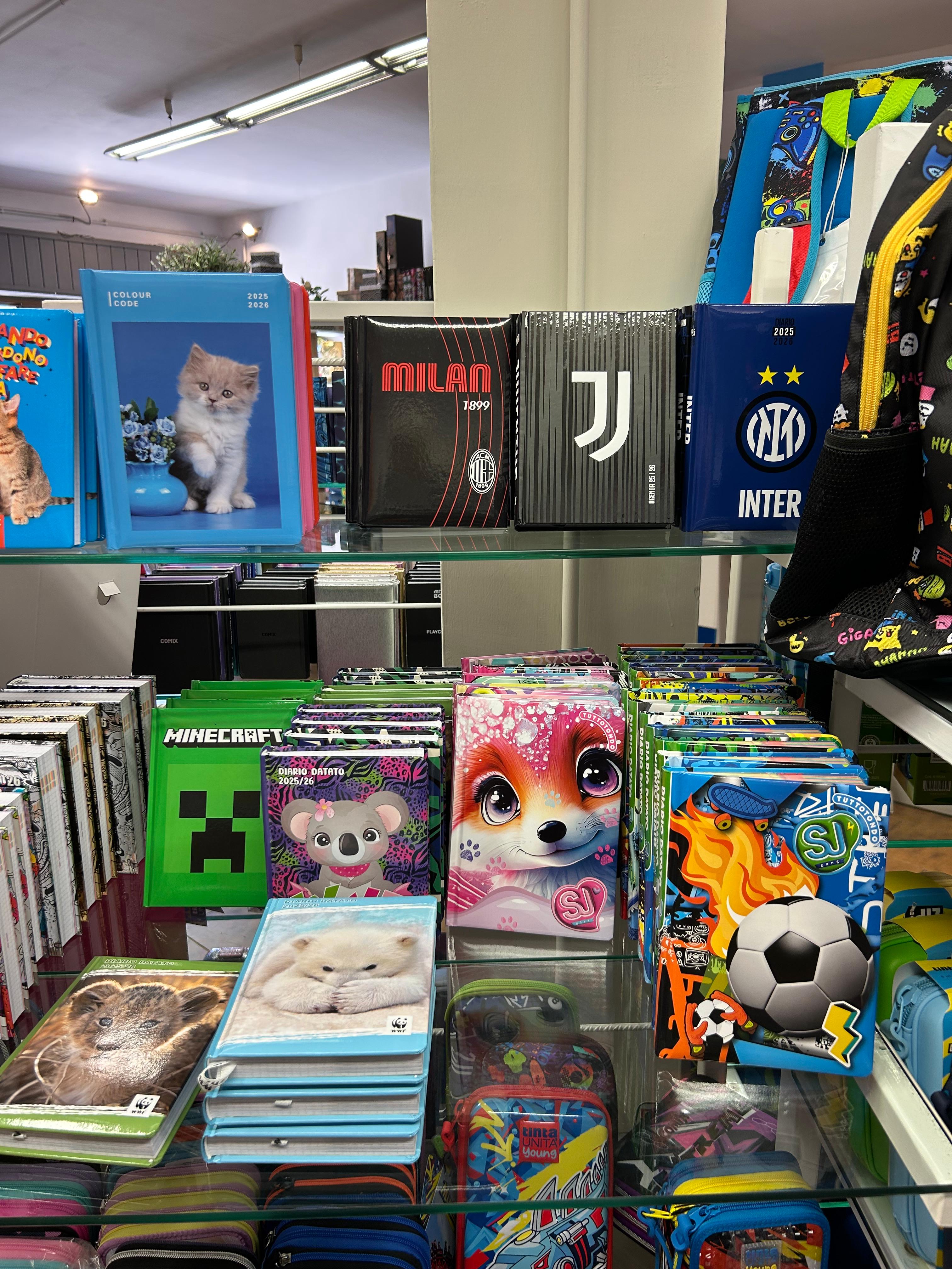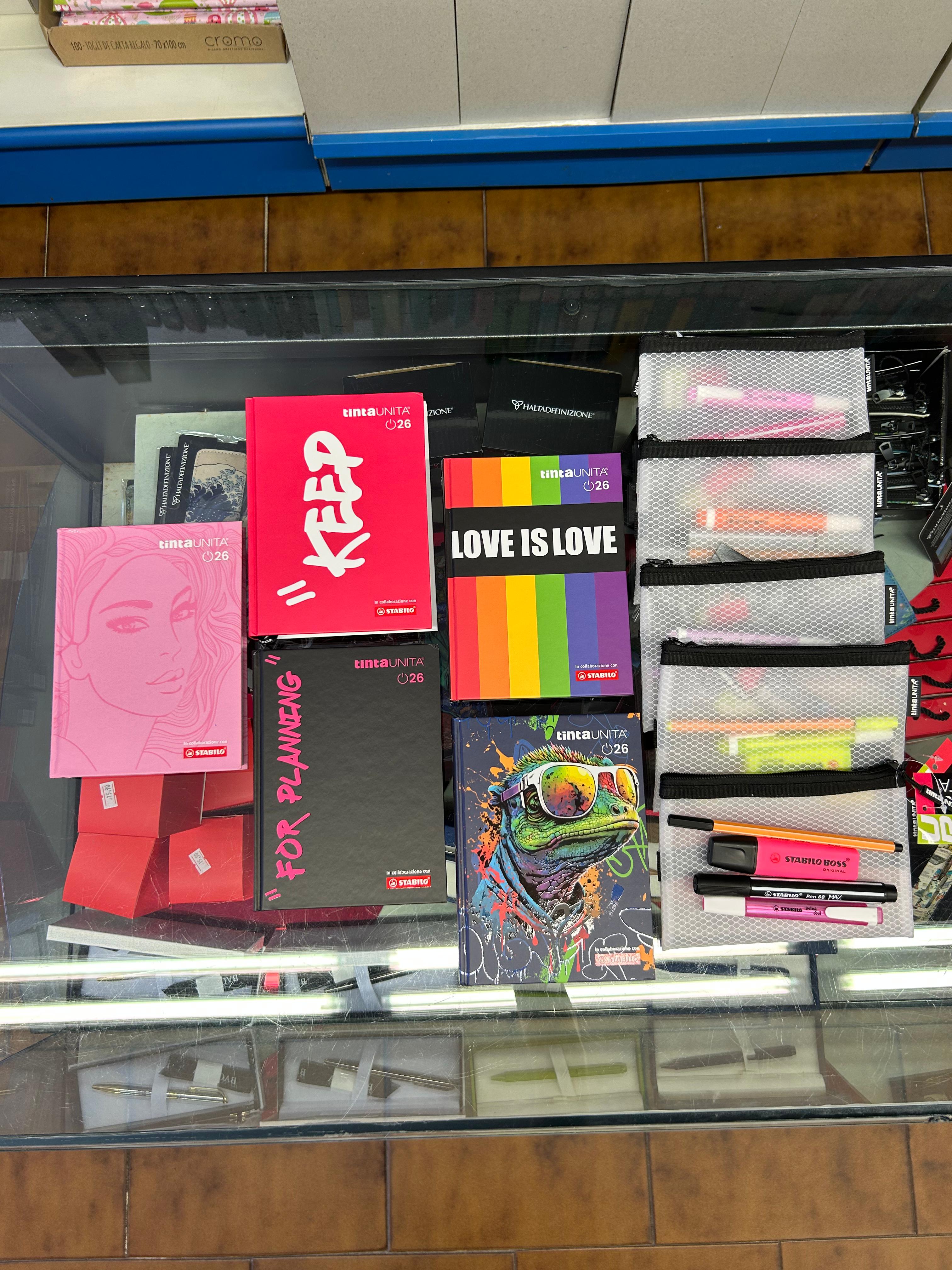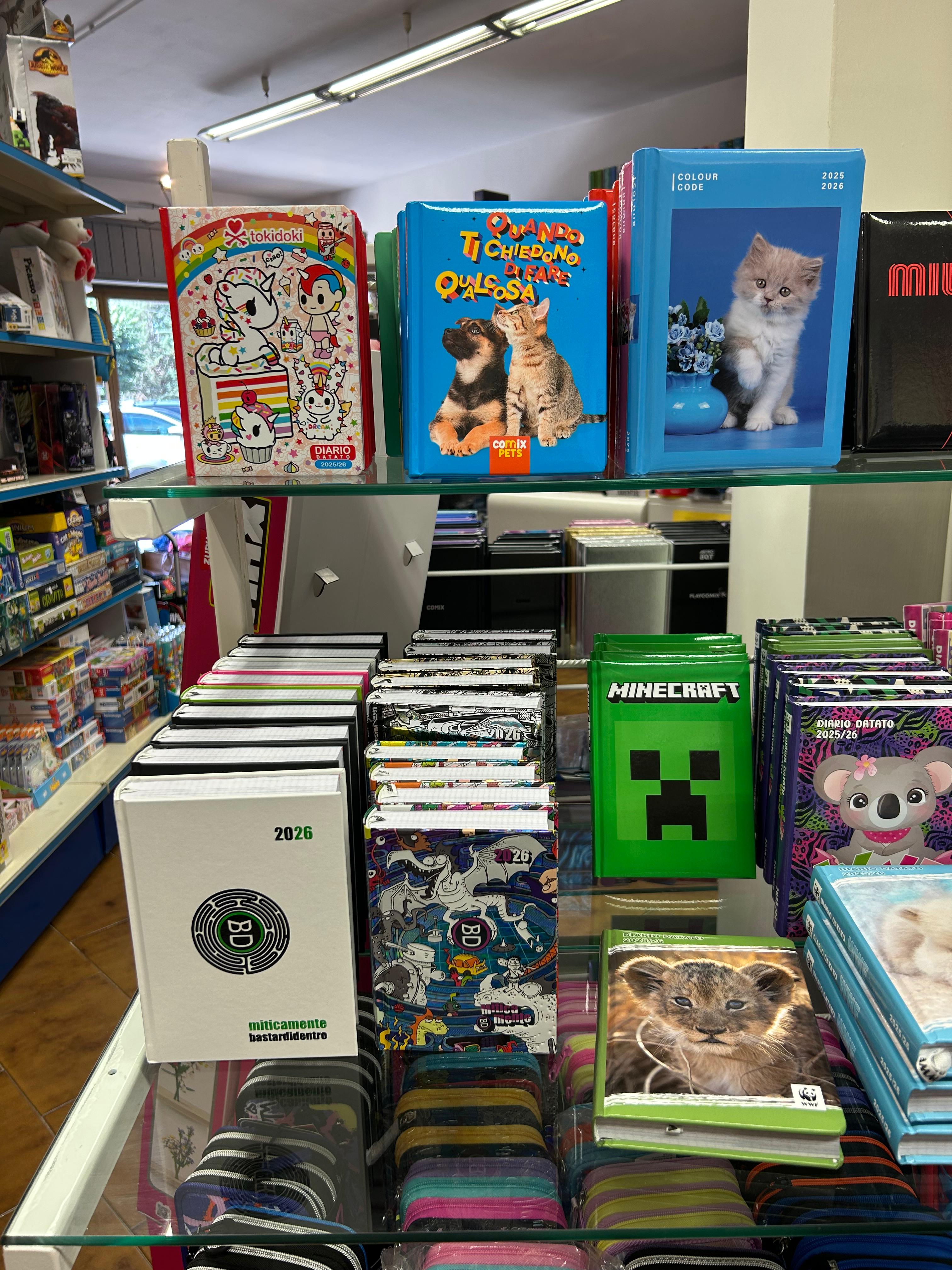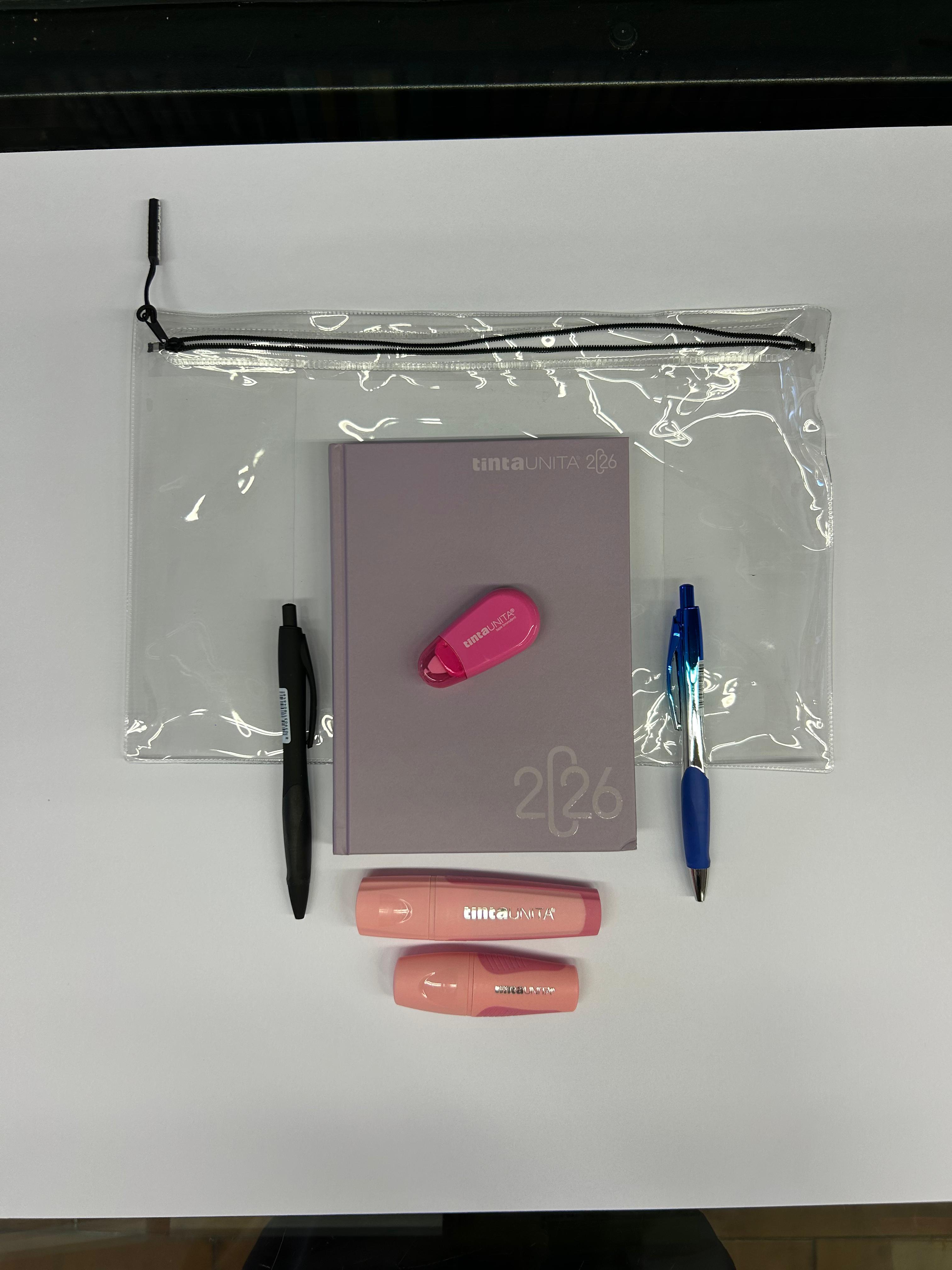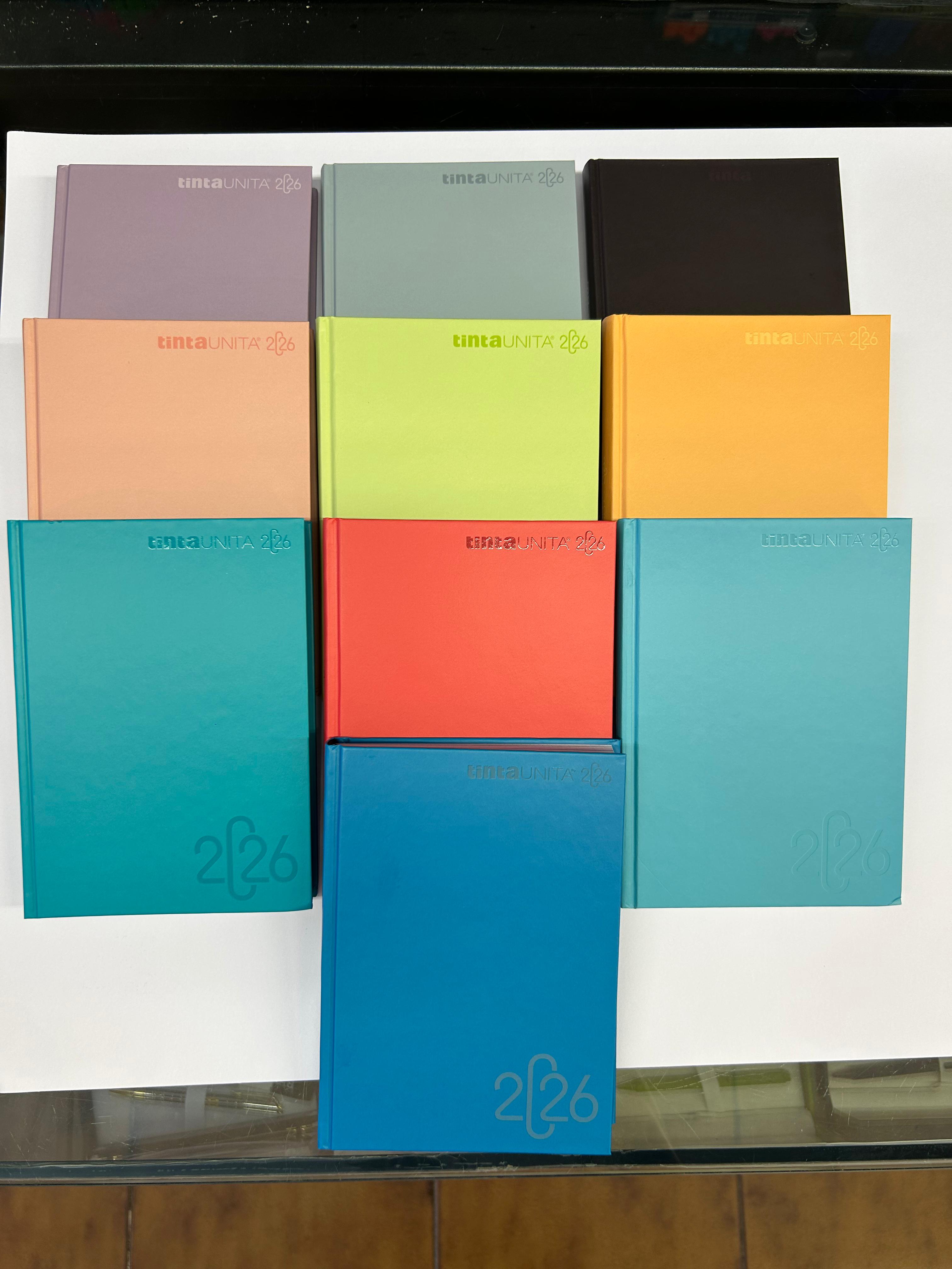 Diari tinta unita in vari colori con custodia, evidenziatori, bianchetto e penne